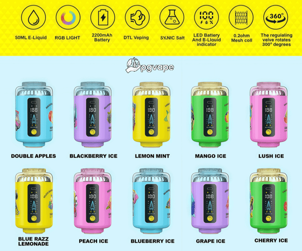 Built with a 50mL e-liquid tank, ensuring extended vaping sessions and stable flavor output.