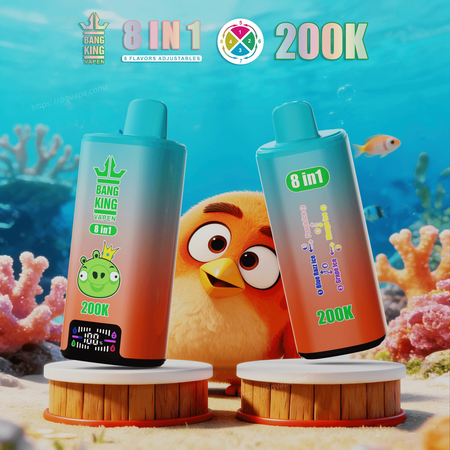 Bang King Vapen disposable vape with a red-to-blue gradient, crown logo, Angry Bird graphic, 200K puffs, and 8 in 1 flavors.