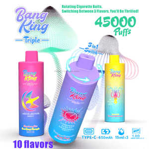 Bang King Triple 45000 Puffs Disposable Vape redefines versatility with 3 rotating flavors, 45,000 ultra-long puffs, and a 45mL e-liquid capacity (15mL×3). Powered by triple 1.0Ω mesh coils and a 650mAh rechargeable battery, it delivers rich, smooth vapor with 0%/2%/3%/5% nicotine options. The innovative rotating mouthpiece enables instant flavor switching, while Type-C fast charging ensures minimal downtime. Choose from 10 premium flavor trios, packaged 10 pieces per box for retail excellence.