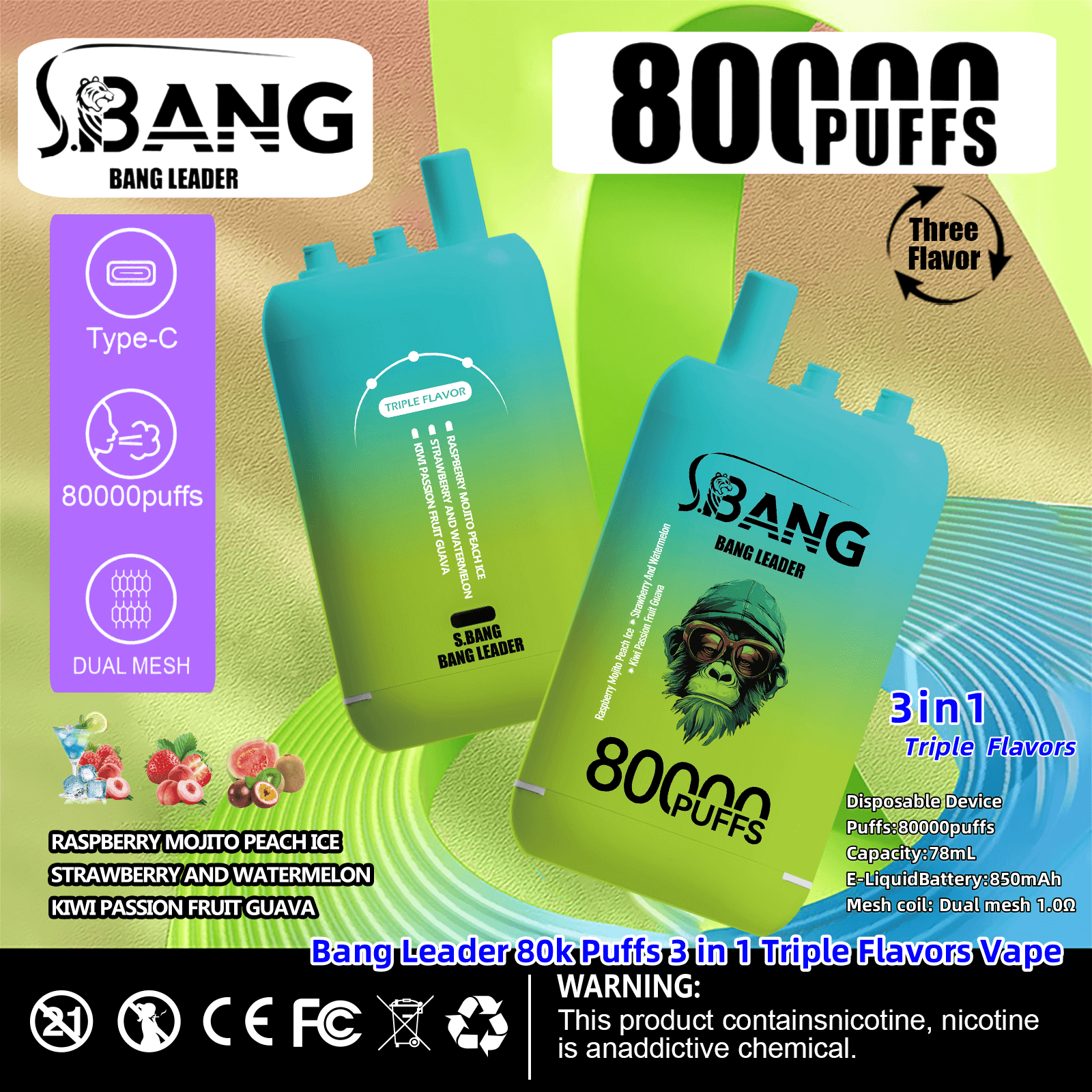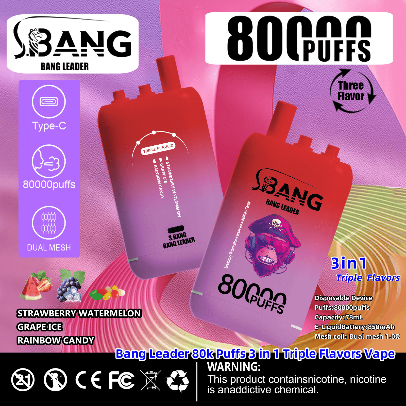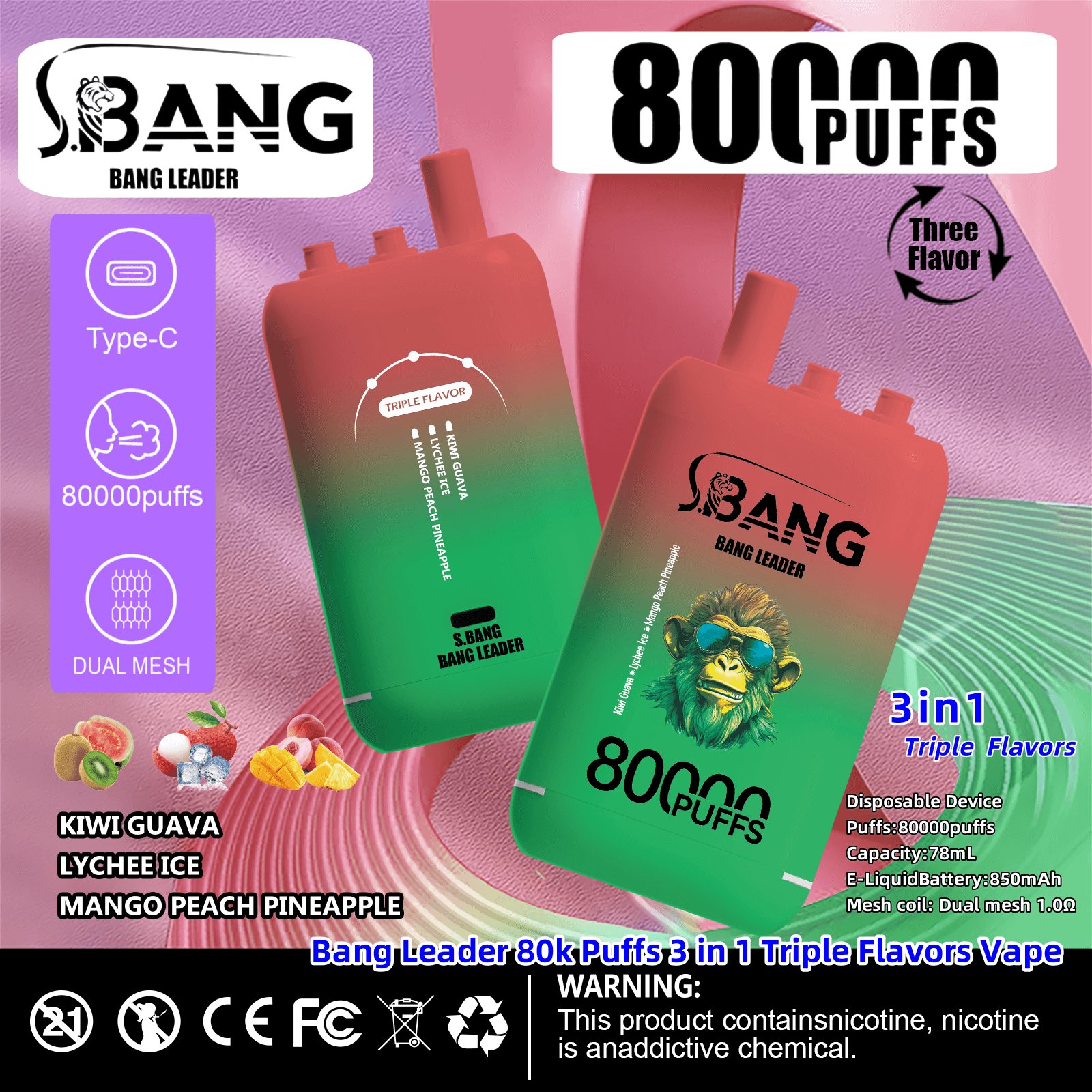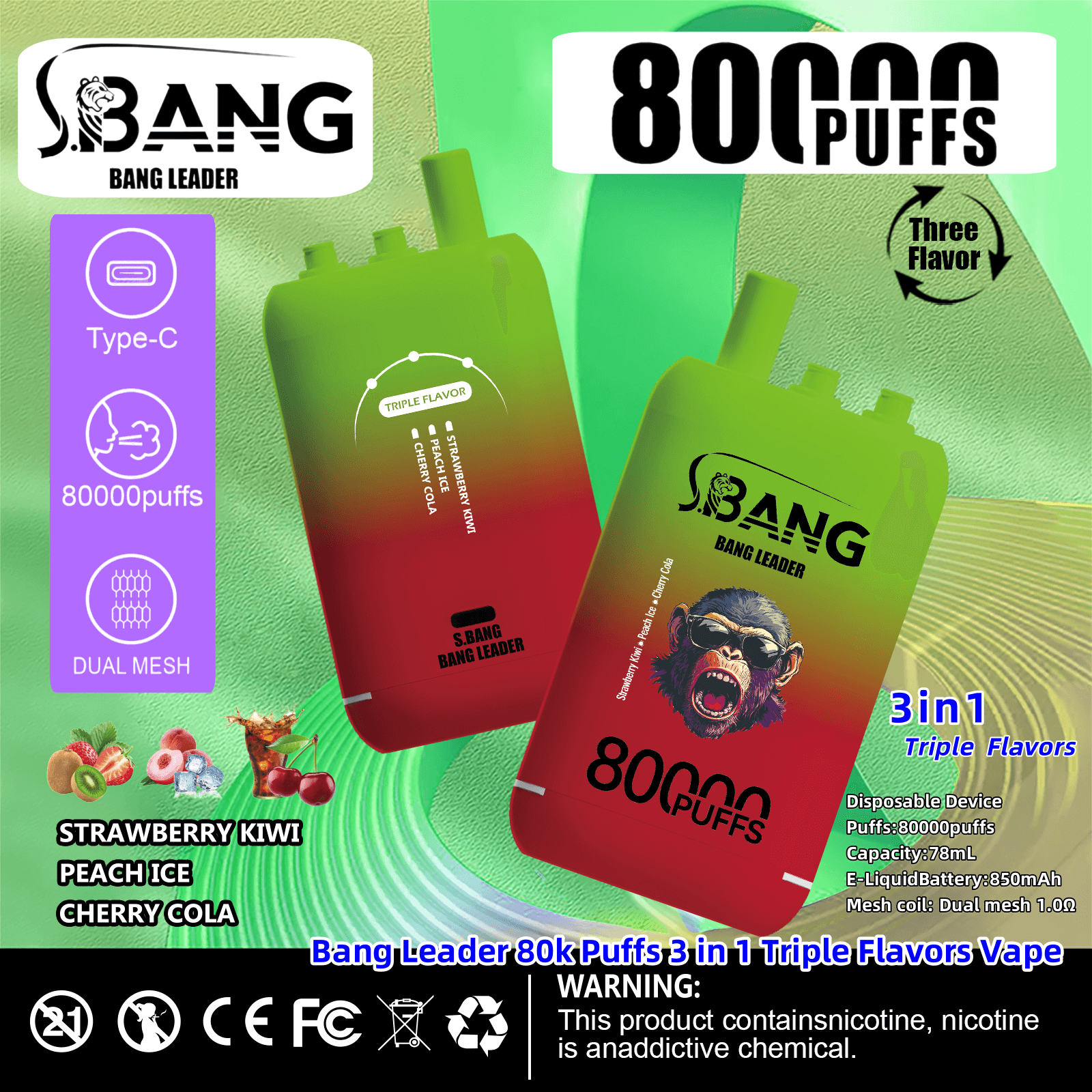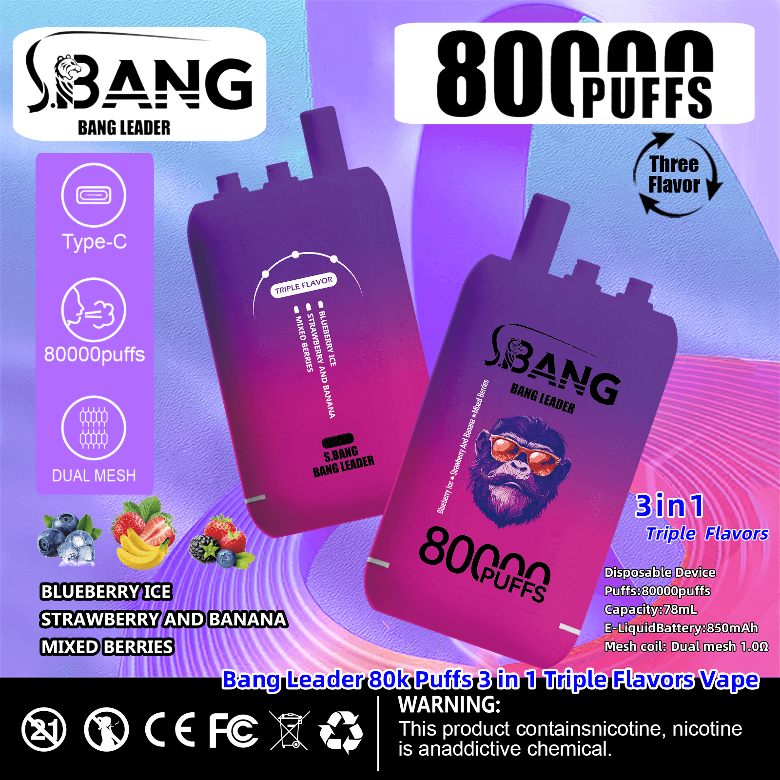 Bang Leader 80000 | 80K Puffs 3 in 1 Triple Flavors Disposable Vape Product Specifications: