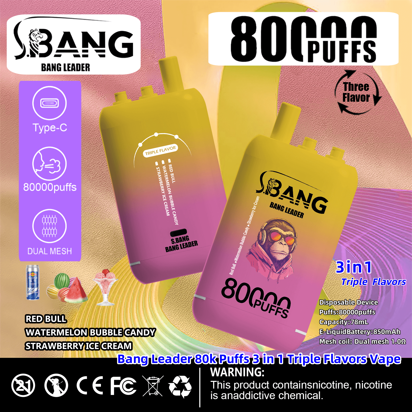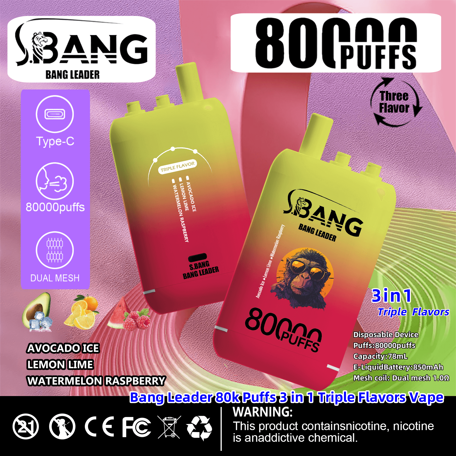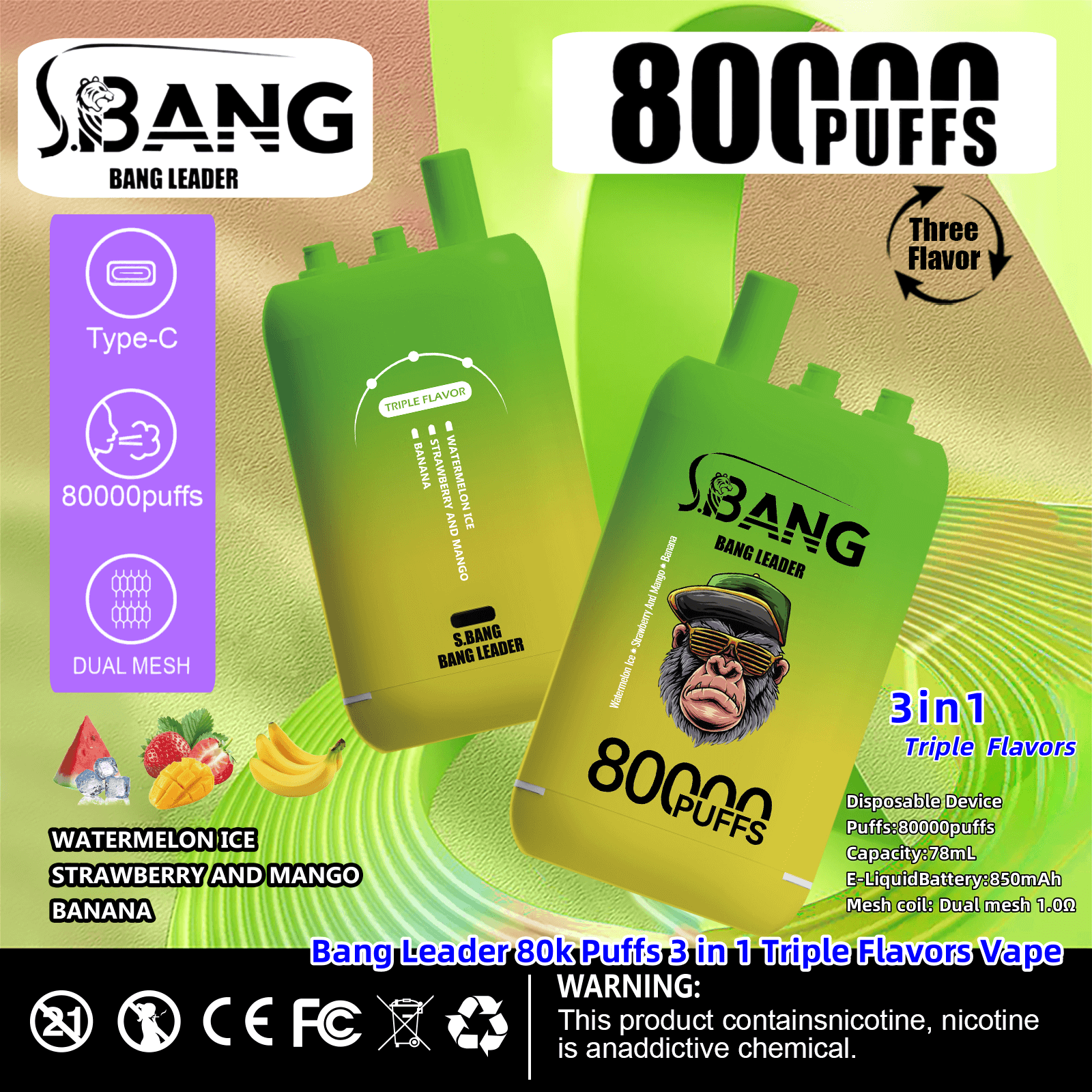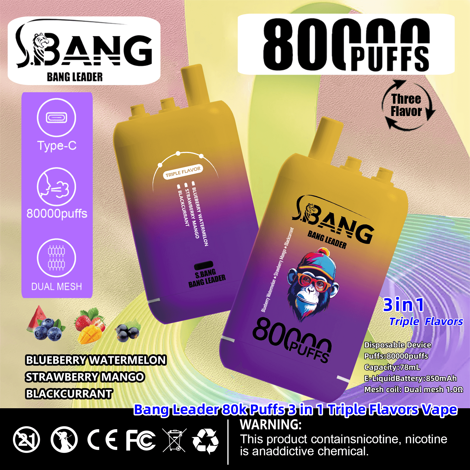 Bang Leader 80000 | 80K Puffs 3 in 1 Triple Flavors Disposable Vape Product Specifications: