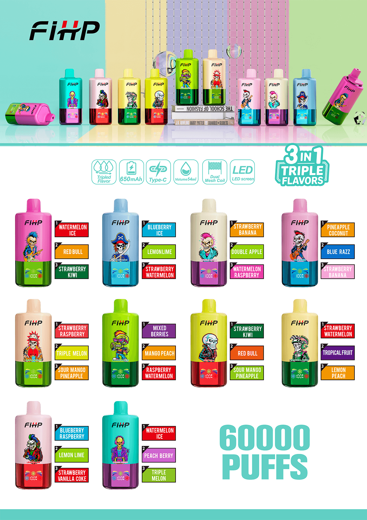 FIHP 60000 | 60K Puffs 3 in 1 Flavors Disposable Vape Flavor List