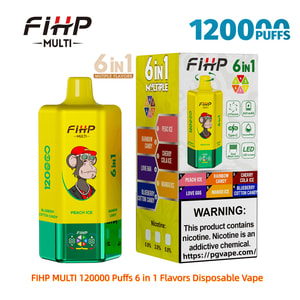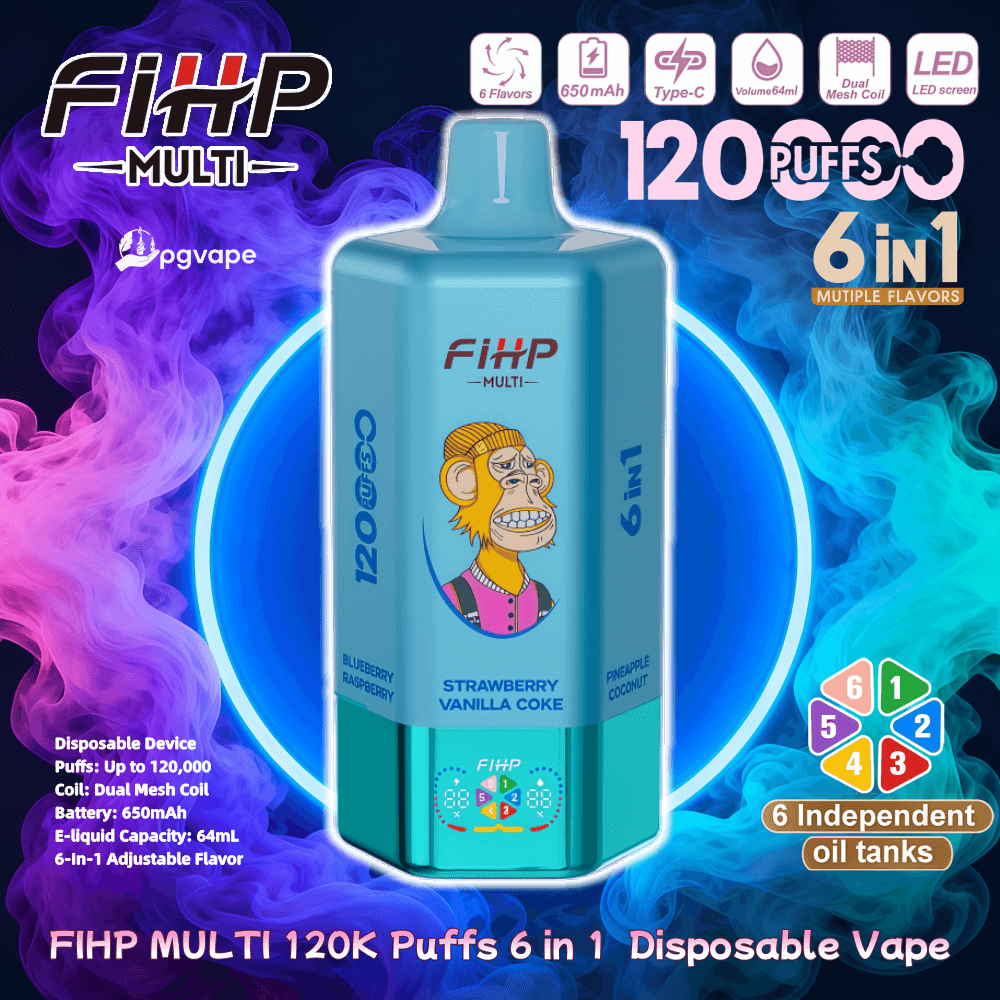 FIHP MULTI 120000 Puffs Disposable Vape Redefines Vaping With 120,000 Ultra-Long Puffs And 6 Adjustable Flavors In One Device. Powered By A 650MAH Rechargeable Battery With Type-C Fast Charging, It Features A Dual Mesh Coil For Rich, Smooth Vapor And A 64ML E-Liquid Capacity For Extended Enjoyment. The LED Smart Display Tracks Battery & Puff Status, While Its Compact Design Ensures Portability.