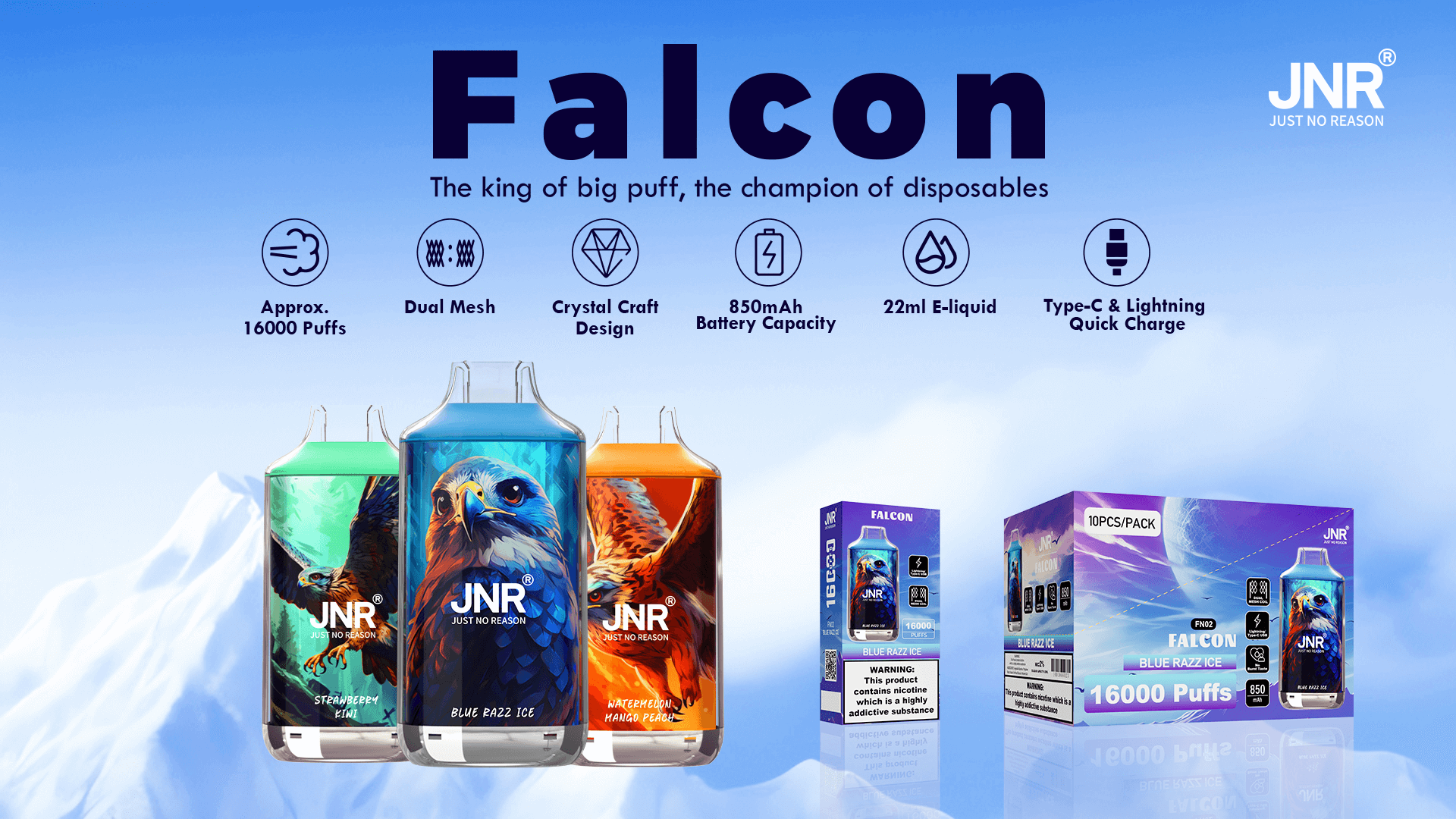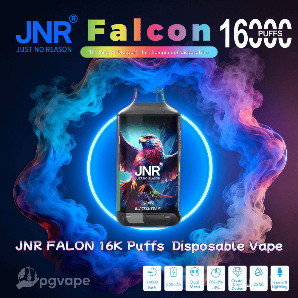 JNR Falcon 16000 Puffs combines high-performance vaping with sleek crystal-craft design, delivering 16,000 ultra-smooth puffs from its 22mL e-liquid capacity. Powered by an 850mAh rechargeable battery and 1Ω dual mesh coil, it produces 30% richer flavor and denser clouds. The adjustable airflow allows customized draws, while the premium crystal shell adds luxury. With 2% nicotine and 25 exotic flavors, it’s perfect for vapers who value style and substance