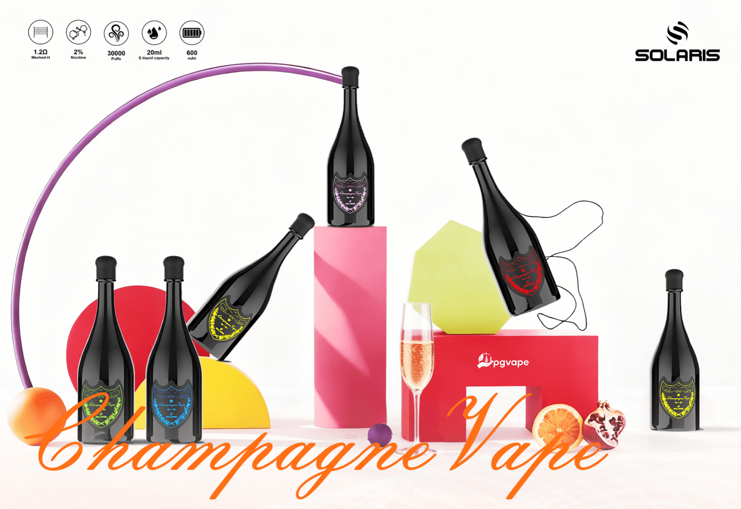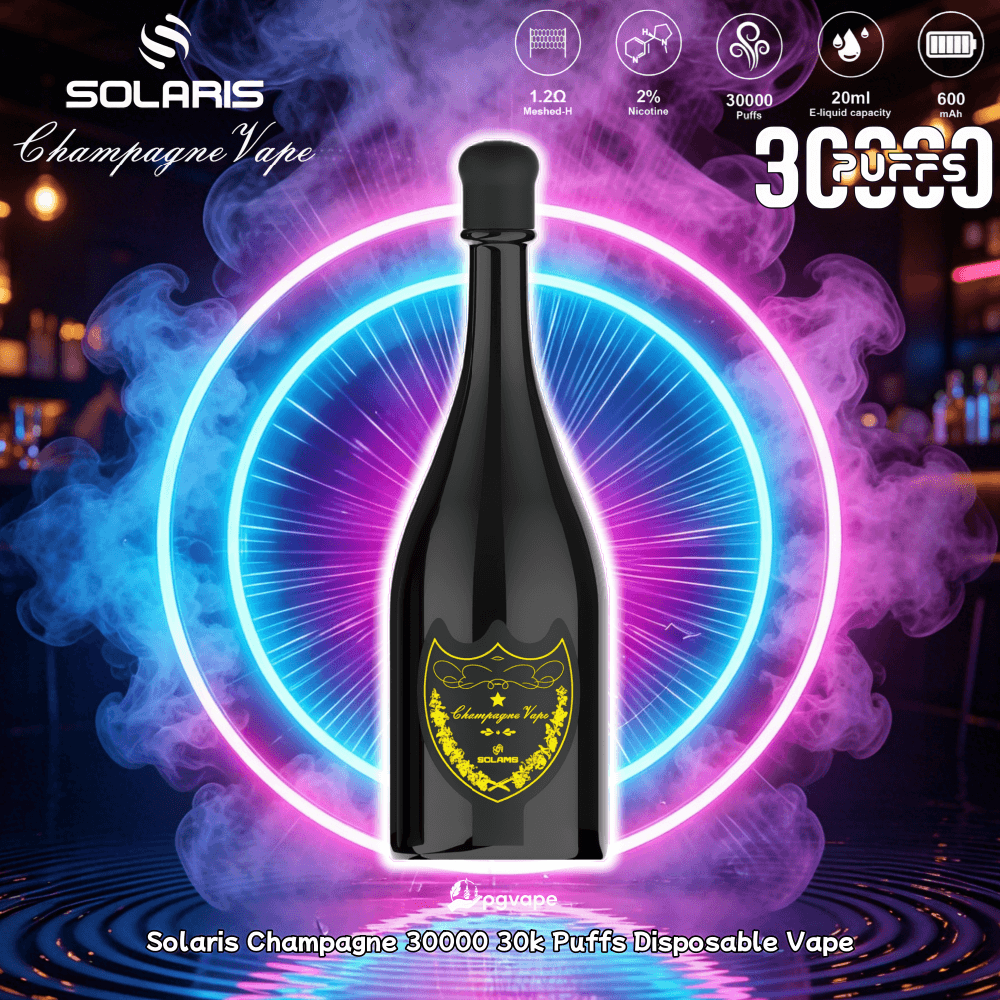 The Solaris Champagne 30K Disposable Vape combines elegant design with reliable performance, delivering up to 30,000 puffs in a unique champagne bottle shape.