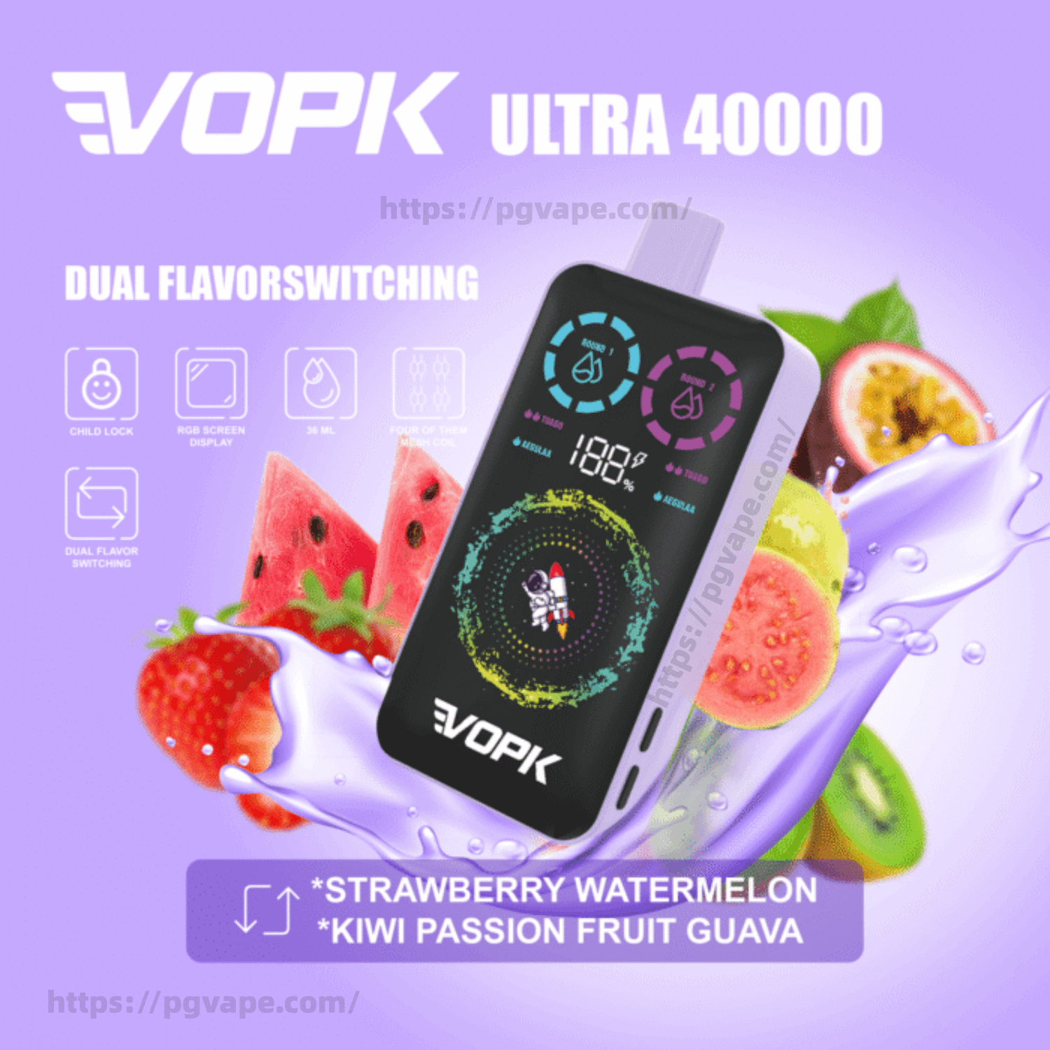 VOPK ULTRA 40000 Puffs Disposable Vape Delivers Unmatched Customization With Dual Flavor Compartments And 40,000 Ultra-Long Puffs. Featuring Four Mesh Coils For Maximum Flavor And Vapor Production, This Advanced Device Offers 36mL E-Liquid Capacity, 850mAh Rechargeable Battery, And Adjustable Power Settings. The Large Dynamic Screen Displays Real-Time Oil Levels, While 0%/2%/3%/5% Nicotine Options Cater To All Preferences. With 10 Flavor Combinations And Dual Draw Modes, It’s The Ultimate Choice For Discerning Vapers.