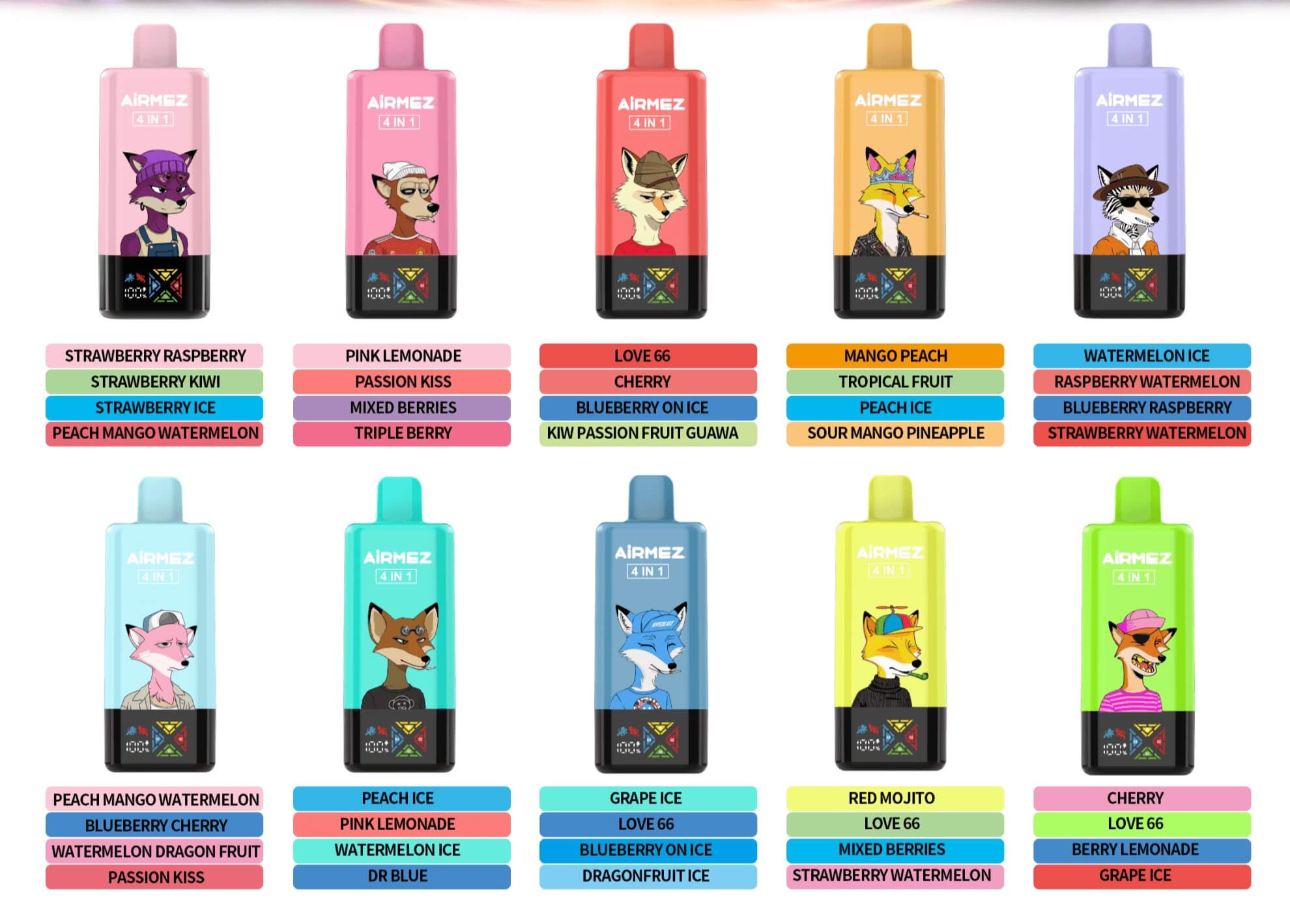 Airmez Fox 120000 120k bloss, 60 ml, 4-i-1 smaker, 1,0 Ω mesh, LED display, Typ-C, 2-5% nic.Fyra smaker, sextio milliliter, hundra tjugo tusen moln.