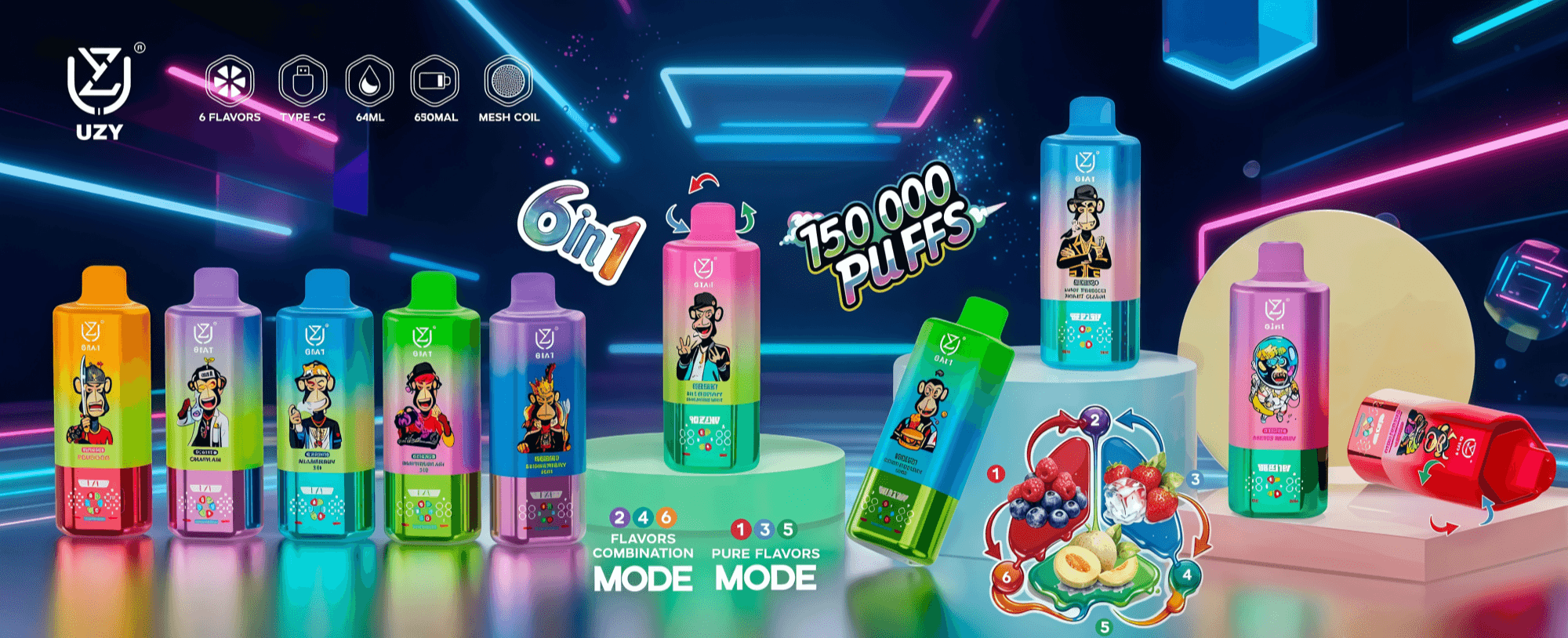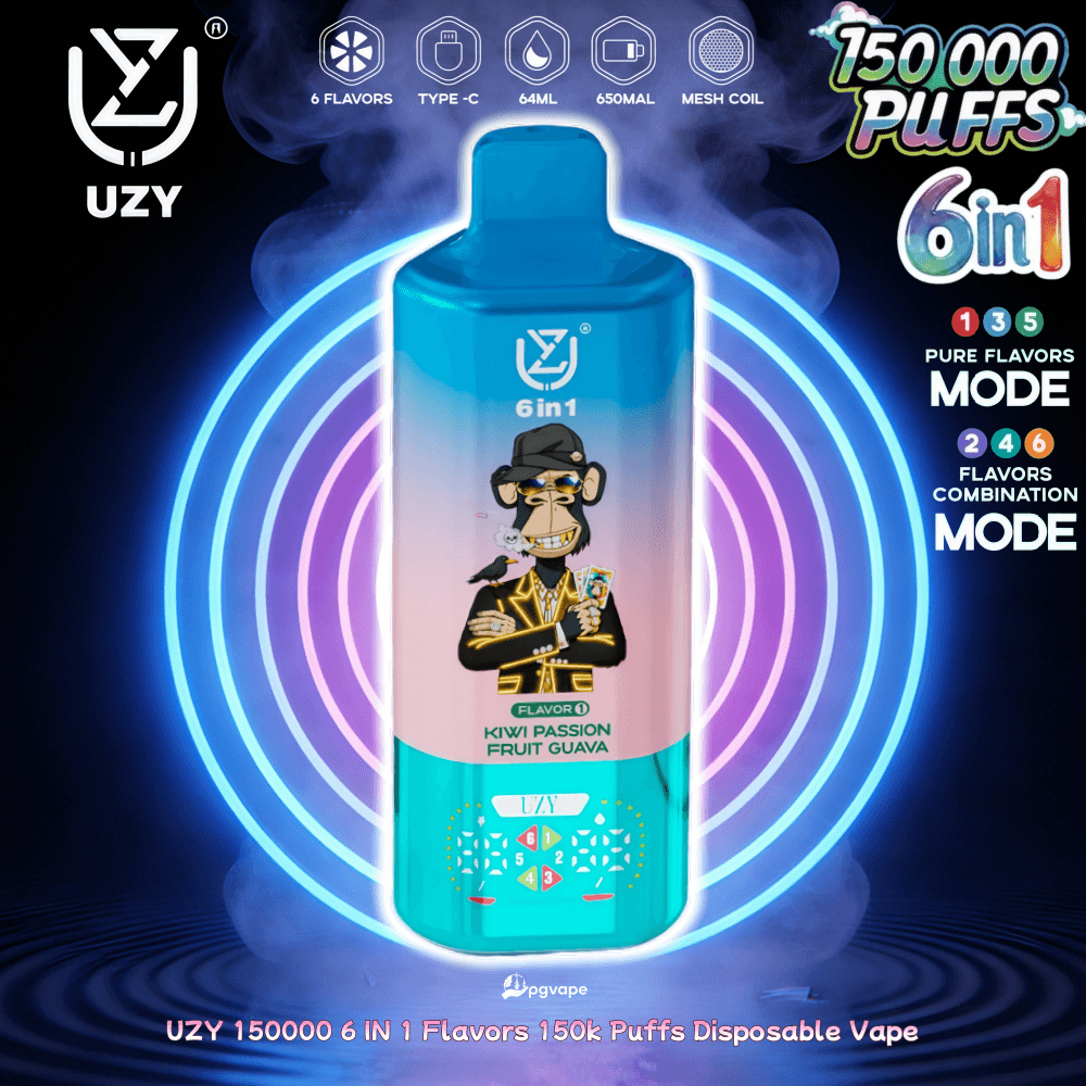 UZY 6 IN 1 150K Disposable Vape kombinerar ultrahög kapacitet med avancerad prestanda, ger upp till 150 000 bloss och ett 64 ml e-vätskesystem för långvarig användning.