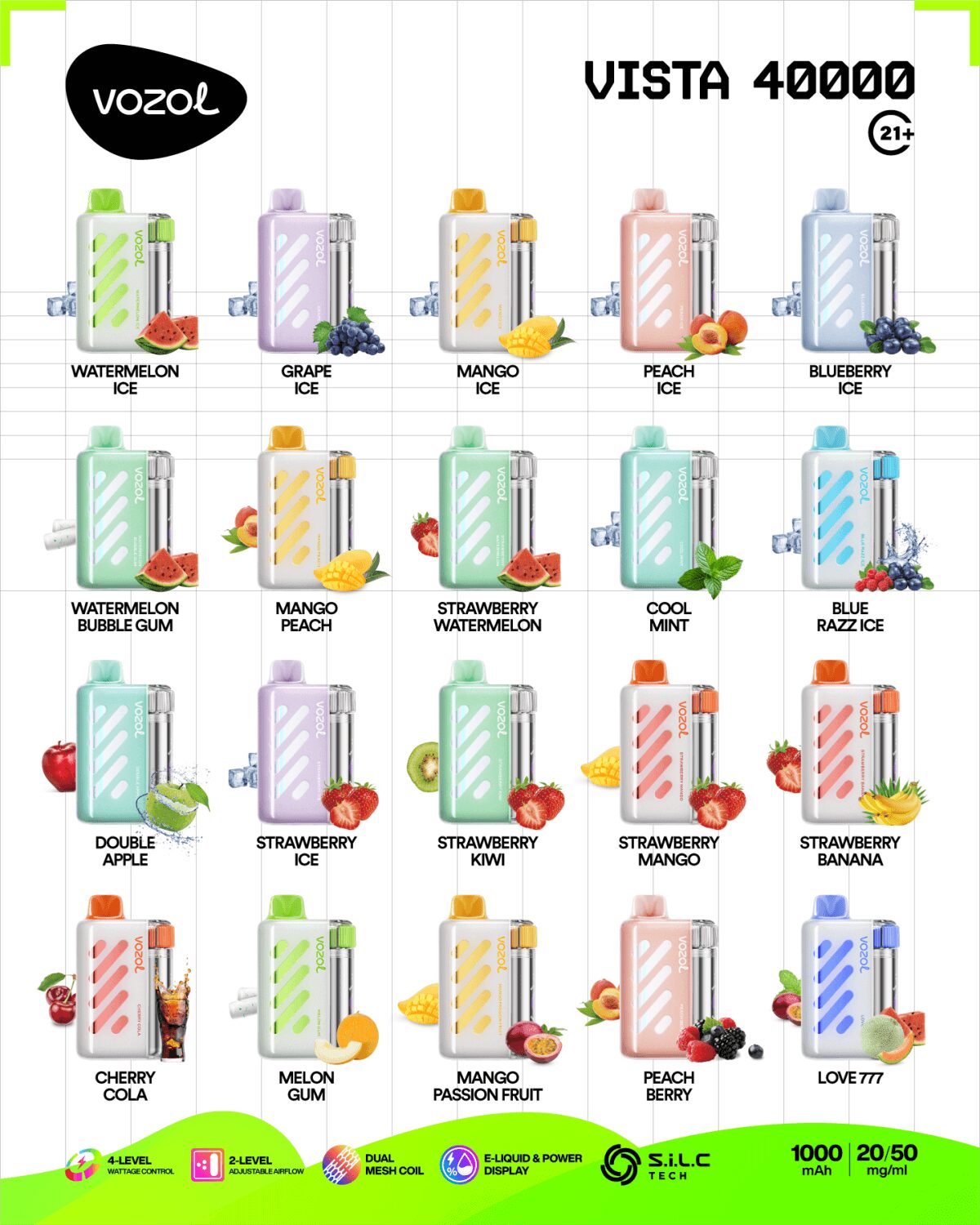 Vozol Vista 40K Puffs Disposable Vape omdefinierar vaping excellens med 40 000 ultralånga puffar och 8 justerbara smaknivåer. dual mesh spoleteknologi och 1000mAh uppladdningsbart batteri, den levererar jämn, konsekvent smak under hela dess livslängd. roterande interaktionssystem och 4-nivås wattkontroll ger oöverträffad anpassning, medan smart skärm visar e-vätska och batteristatus i realtid.